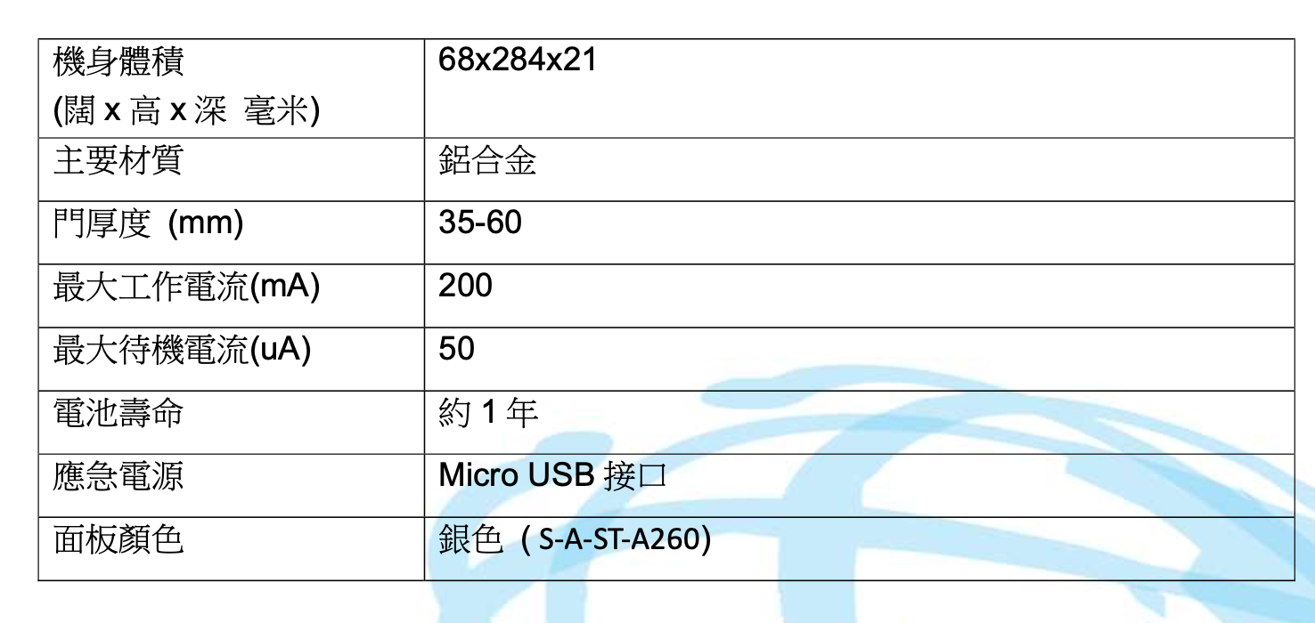 S-A-ST-A260 智能門鎖支援多種解鎖方式,包括指紋、密碼、智能卡、機械鑰匙、人臉識 別、App 等等。透過虛位密碼及防試開功能加強密碼保安。同時具備警報功能,在低電 量或被撬時發出警報。只需輕觸,便可發出門鈴聲。採用國際機械鎖體,可兼容市場上 99% 的鎖體。