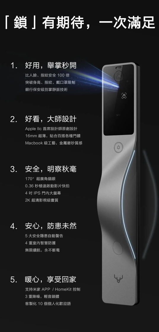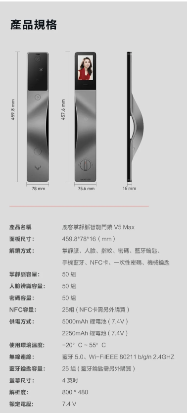 Lockin 鹿客 V5 Max 掌靜脈貓眼智能電子門鎖(Apple HomeKit)(香港行貨)(連原廠基本安裝)