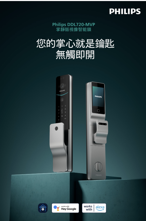 享受掌靜脈開鎖帶來的便利!Philips DDL720-MVP 配備掌靜脈識別功能,只需掃描手掌即可開鎖。無接觸感應即可開門 — 您的手掌就是鑰匙。